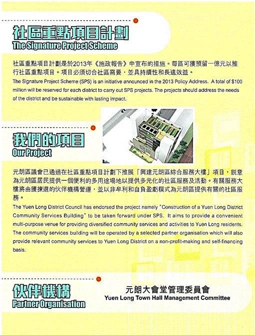 社區重點項目計劃是於2013年《施政報告》中宣佈的措施。每區可獲預留一億元以推行社區重點項目。項目必須切合社會需要,並具持續性和長遠效益。 元朗區議會已通過在社區重點項目計劃下推展「興建元朗區綜合服務大樓」項目,銳意為元朗區居民提供一個便利的多用途場地以提供多元化的社區服務及活動。有關服務大樓將由獲揀選的伙伴機構營運,並以非牟利和自負盈虧模式為元朗區提供有關的社區服務。 伙伴機構 - 元朗大會堂管理委員會