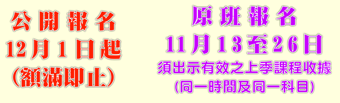須成為本堂會員 上課地點:元朗 體育路 4號 查詢電話:2476 7771 |